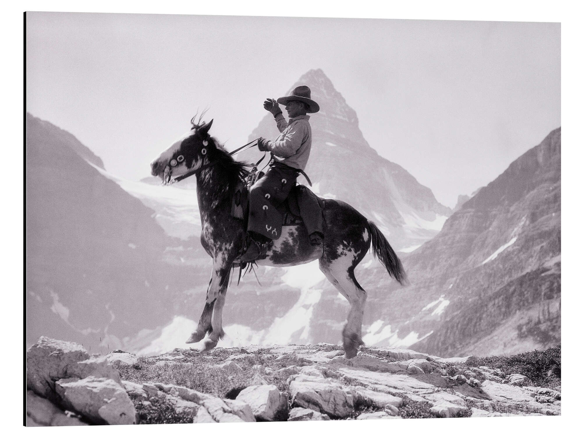 Posterlounge   Vægdekoration   Fotografi   Nostalgi   Print på aluminium Cowboy on a Pinto pony in front of Mount Assiniboine, Canada
